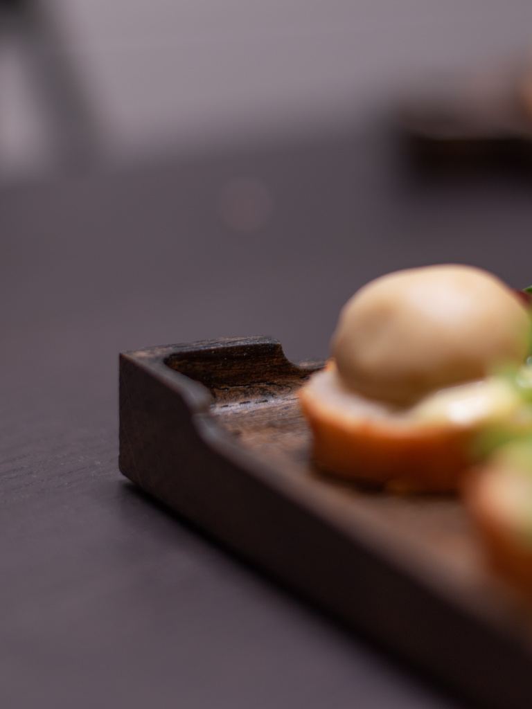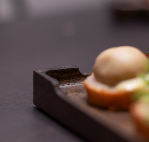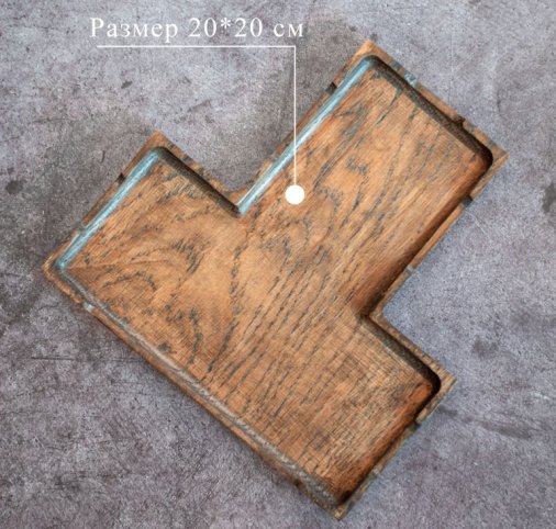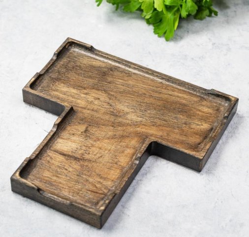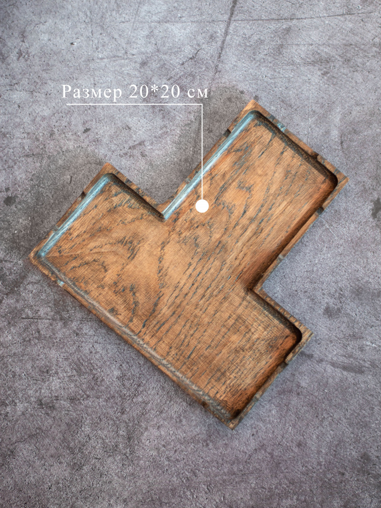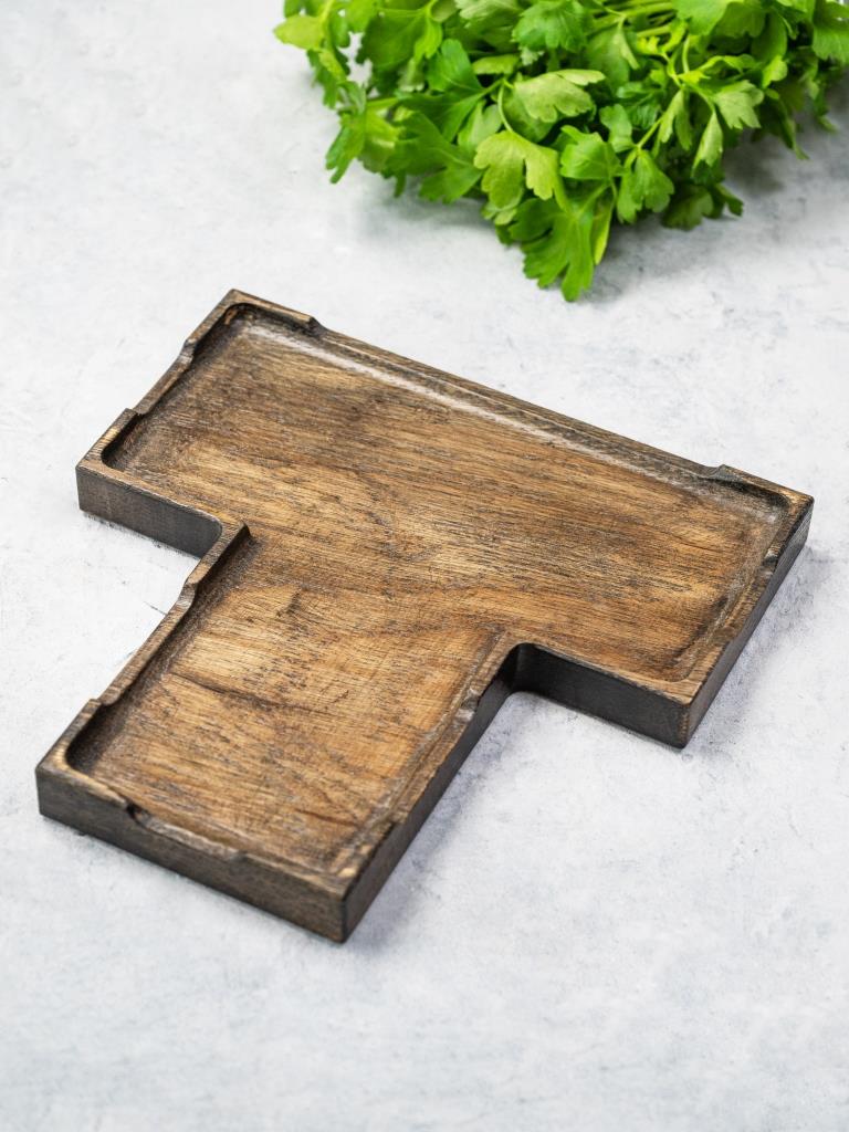 Поднос дубовый фуршетный Т-образный 20*20 см для холодных закусок. Цвет угольный. Покрыт маслом, разрешенным для контакта с пищей. Бортик по краю.