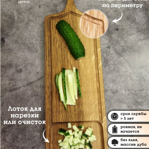 Доска разделочная из цельного дуба "Ветка лозы длинная" с лотком для очисток для взыскательной хозяйки. Размер доски 44*13 см., двусторонняя. Отлично подойдет для разделки рыбы, нарезки салата или подачи мяса.