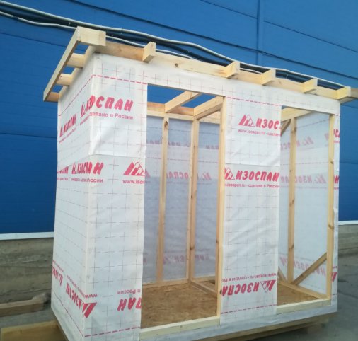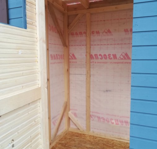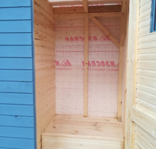Пол и важные узлы обработаны антисептиком, использовалась сухая строганная доска, пол OSB 9 мм, евровагонка, покрашено снаружи.