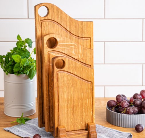 Изумительный набор разделочных досок из массива дуба, состоящий из 3 досок размером 40*19, 30*16, 24*13 см, подставки под 2 доски.