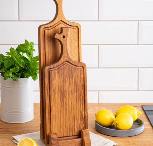 - Подставка под разделочные доски гармонирует с их дизайном, повторяя плавные линии. Она сделана очень изящно, вручную мастером.