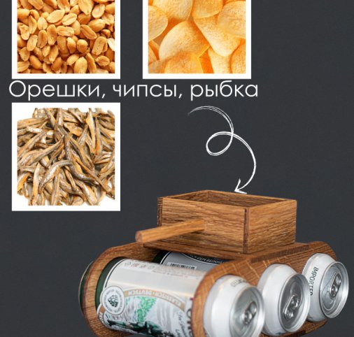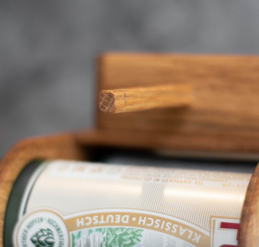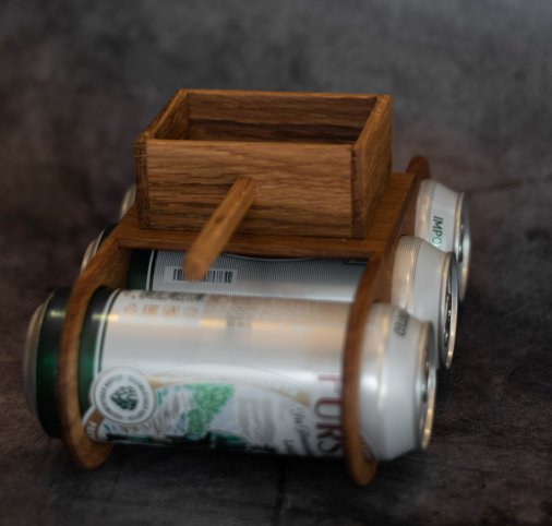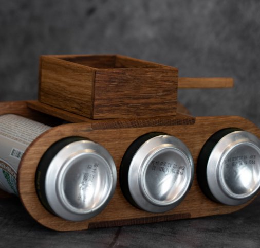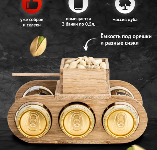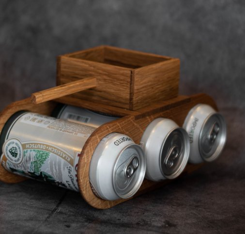 Оригинальный мужской подарок, выполненный из дуба - крепкий, надежный, качественный. Подарочная коробка в виде танка под пиво. Зарядите его 3 банками пива по 0,5л или трикотажными изделиями, а в башню - рыбку, орешки или чипсы!