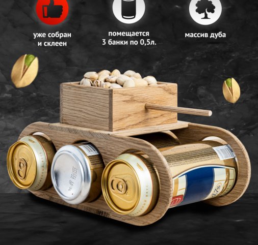 Оригинальный мужской подарок, выполненный из дуба - крепкий, надежный, качественный. На башню танка нанесена надпись "Пивозавр", что делает этот подарок не только оригинальным, но и более персонализированным. Мем 2021 года, о котором писал даже Форбс! Зарядите его 3 банками пива по 0,5л или трикотажными изделиями, а в башню - рыбку, орешки или чипсы.