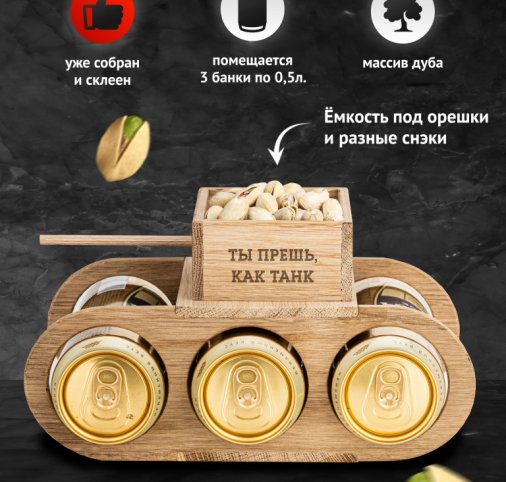 Оригинальный мужской подарок, выполненный из дуба - крепкий, надежный, качественный. Подарочная упаковка в виде танка под пиво. На башню танка нанесена надпись "Ты прешь как танк", что делает этот подарок не только оригинальным, но и более персонализированным. Зарядите его 3 банками пива по 0,5л или трикотажными изделиями, а в башню - рыбку, орешки или чипсы.